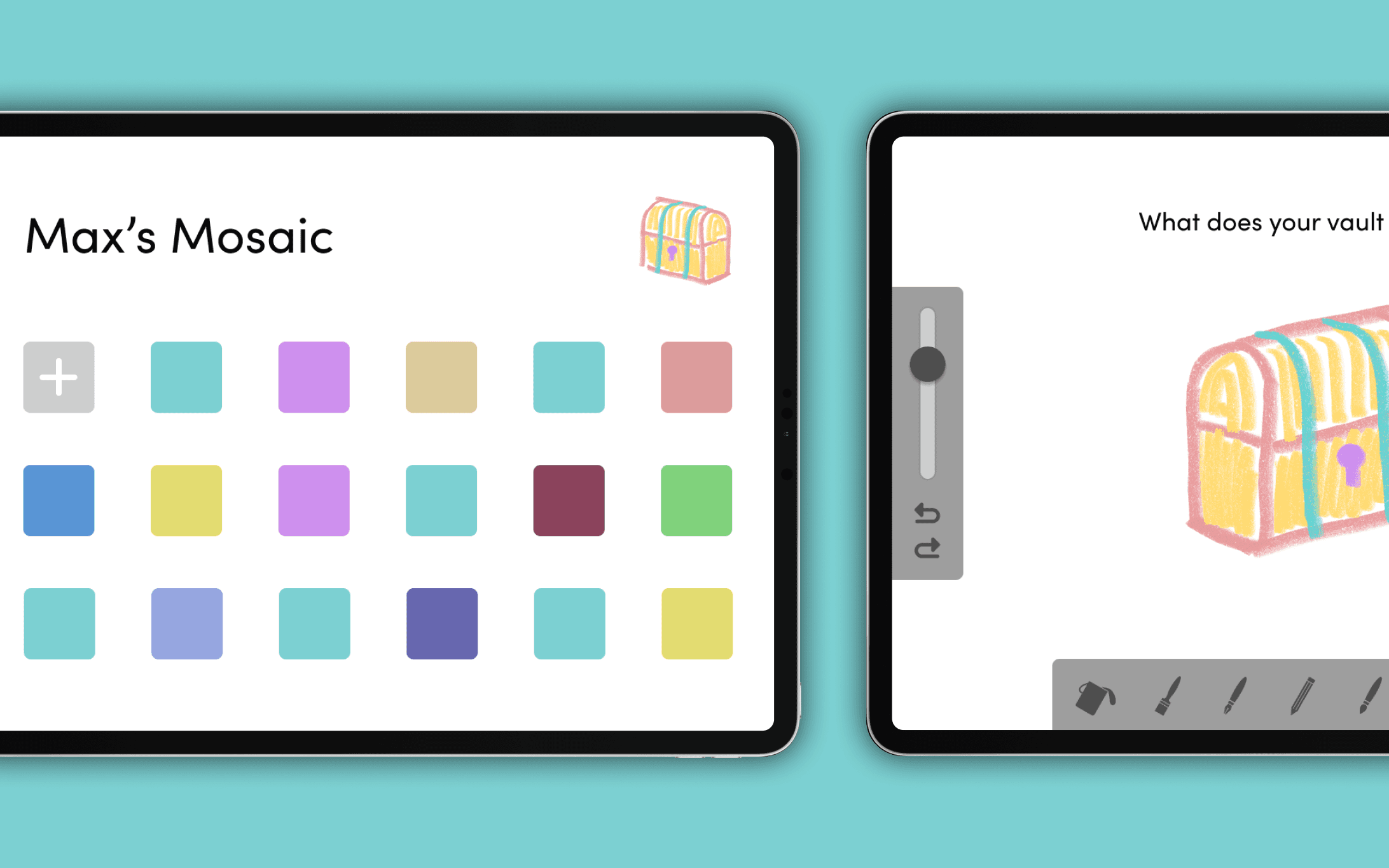 Users' creations can be kept either as part of their Mosaic, a web of their experiences, or locked away in a personalized vault for safekeeping. Mosaic is an outlet to creatively express experiences and recognize and honour feelings.